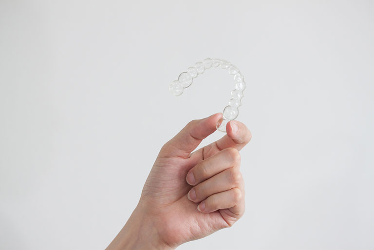 インビザラインはマウスピース矯正の1種。ワイヤーやブラケットを歯に固定させる矯正とは違い、自分で着脱が可能なマウスピース型の矯正装置です。厚みが薄く、色味は透明に近い装置なので、至近距離でも目立たず、矯正中であることが気づかれにくいのが大きな特徴です。